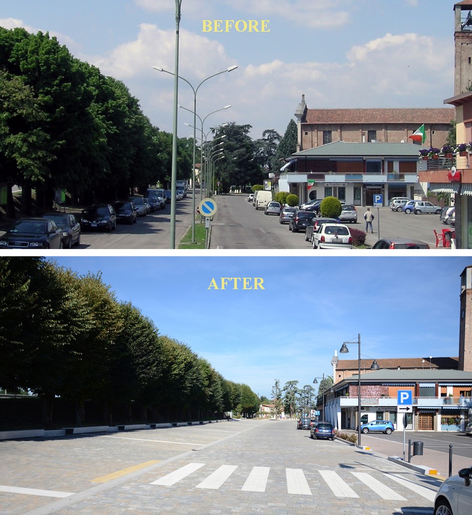 PIAZZA DANTE ALIGHIERI. A Canda (RO) la piazza centrale si trasforma in un grande spazio pedonale che ristabilisce il giusto equilibrio tra uomo e macchina. STUDIO PAOLETTI - VENTURINGEGNERIA – MASSARENTE ARCHITETTURA